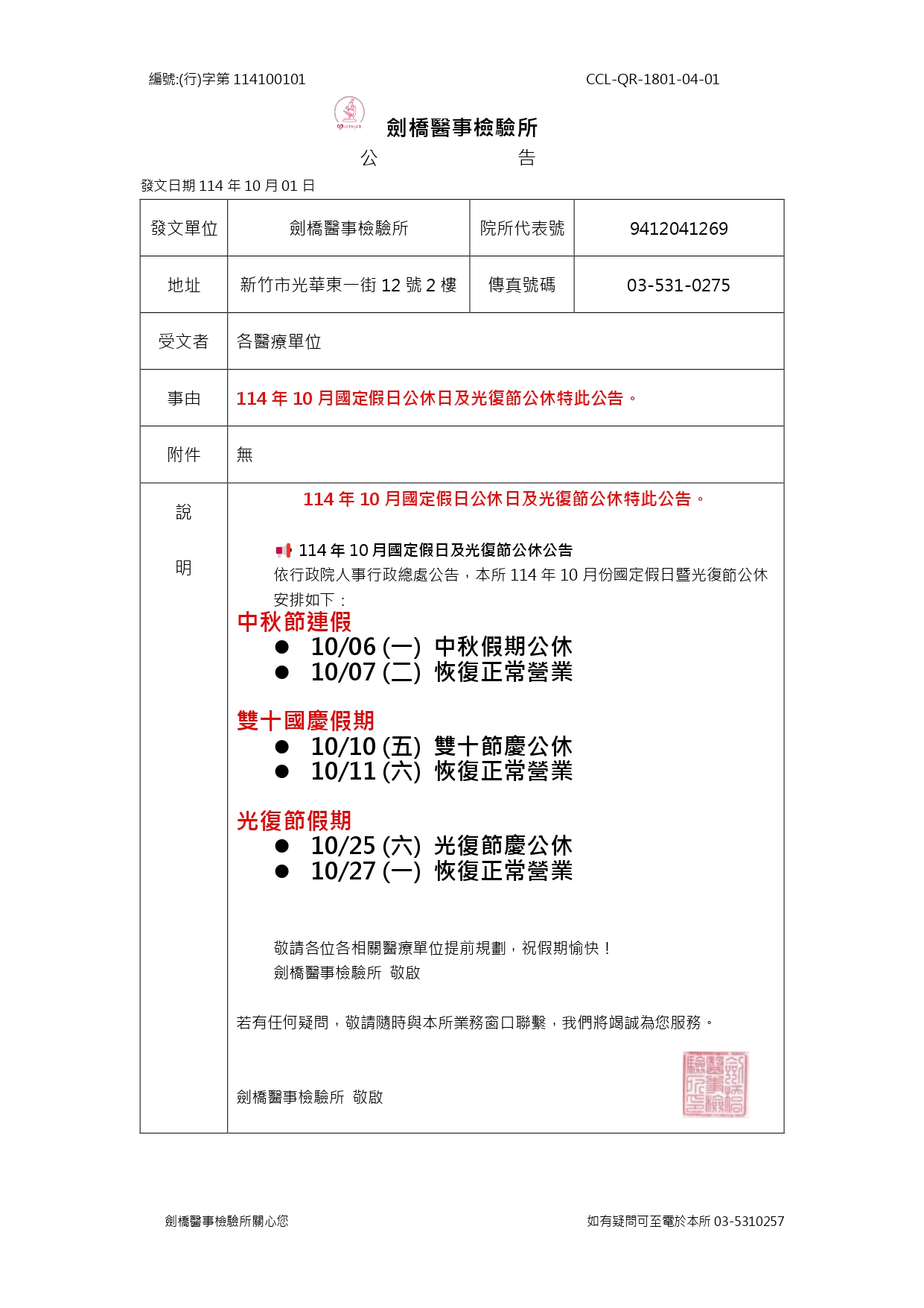 首頁 最新消息 醫事檢驗所公告 (行)字114100101-114年10月國定假日公休日及光復節公休特此公告。 瀏覽人數: 102 最新消息 (行)字114100101-114年10月國定假日公休日及光復節公休特此公告。 發表時間:2025-10-01 回上一頁